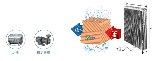 透過冷卻交換板上之水份過濾空氣,使其達降溫效果。